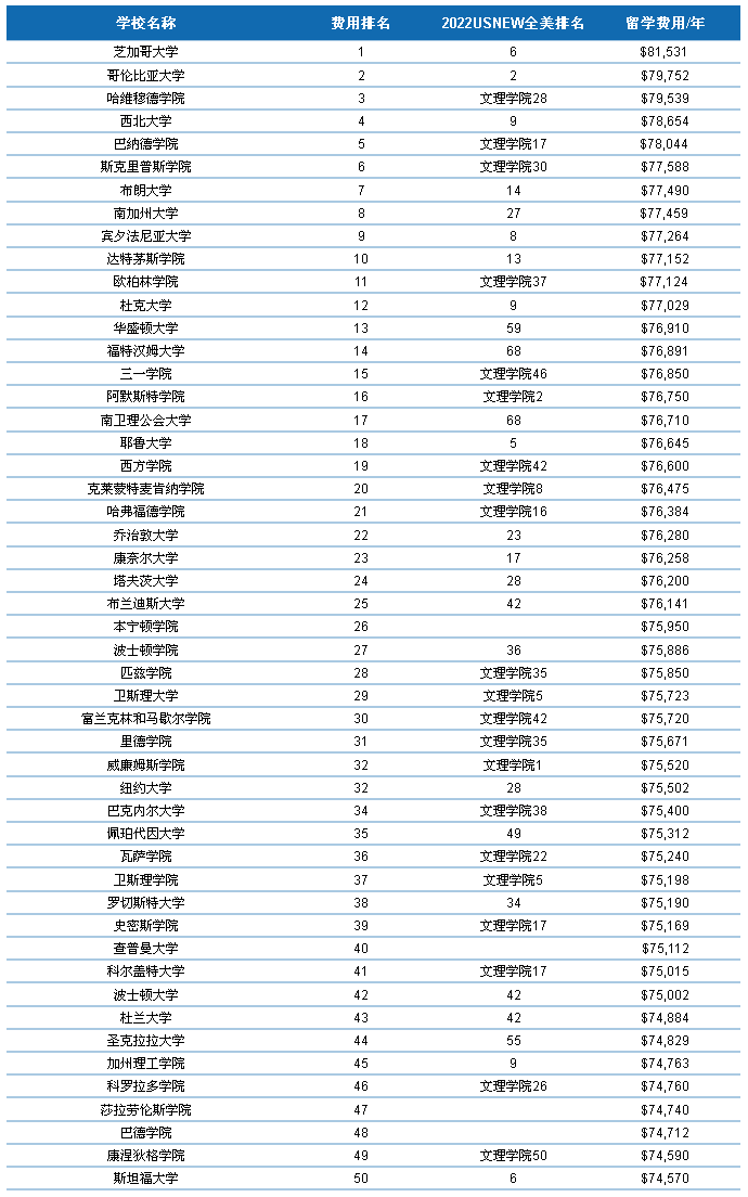 以上排名是根据美国国家教育统计中心公布的州外学费、杂费和食宿费,所统计到的美国50所最昂贵的四年制院校。