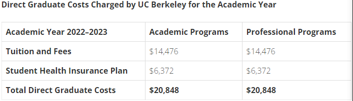 最常申的公立的加州大学系硕士项目,以加州大学伯克利分校(University of California, Berkeley,简称UCB)硕士项目为例,一年的总费用包括学费(国际生需要另缴补充学费)、保险费和生活费。
