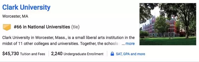 时下,美国大学2019年申请正在火热进行中,在选校时注重排名的童鞋们有没有注意到这样一所院校呢,全美排名66——克拉克大学!克拉克大学可以算得上美国大学里一股低调存在的清流,从不过分营销,只是默默耕耘在研究教育的一线。今天就让兆龙留学小编好好为大家介绍一下这所北美学术界的真·宝藏。