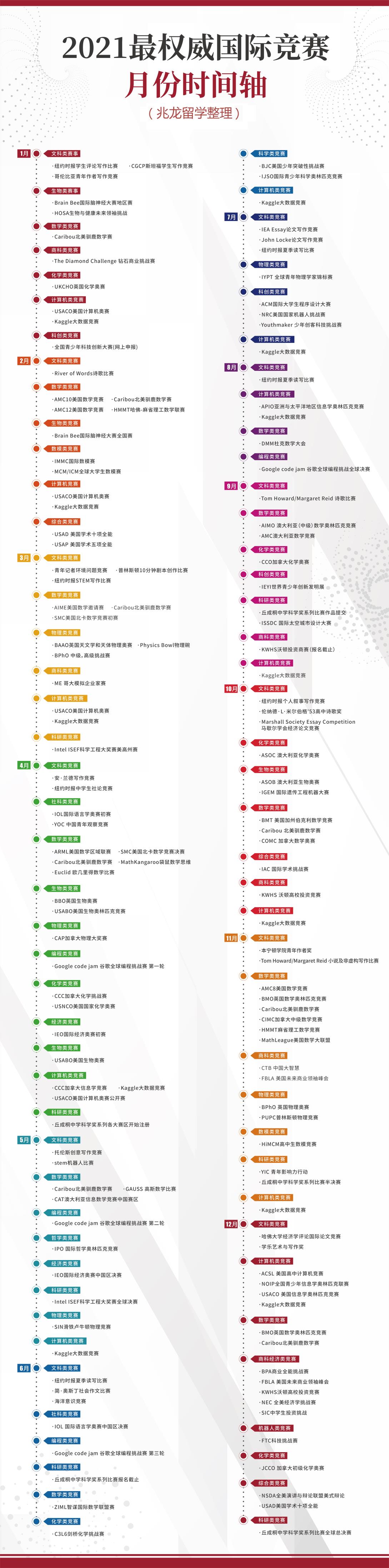 那么,对于新一年申请的同学,该如何做准备,现在已经到关键时候了。申请名校、藤校的同学,至少也要几个拿得出手的竞赛,无论学科的,还是社会科创学术方面的。下面,兆龙留学为大家整理出了当前拿到录取的同学常参加的一些竞赛类项目,供大家参考。关于什么样的项目适合孩子,及如何给孩子做早申请规划这些,鉴于篇幅关系,大家可以直接微信或致电联系,我们非常资深的规划老师帮大家详细介绍。