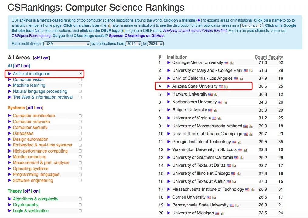另外,在计算机科学领域,有一个更能反映学校研究实力的排名,那就是CS Rankings,这项排名主要参考的是大学的研究成果。大家知道,计算机科学的研究方向很多,包括人工智能,计算机系统,计算机理论,以及很多交叉学科,这些都属于计算机科学的范畴。每个方向下面又有更细的分支。在CS Ranking榜单中,ASU整体排名在全美位列第50。但是ASU非常厉害的方向——人工智能方向,排名全美第4位。