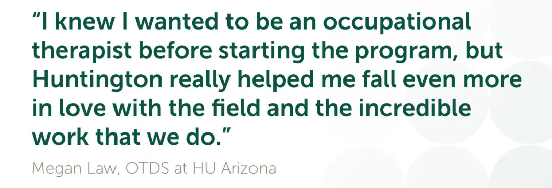 亨廷顿大学的作业治疗博士项目(OTD)提供了一般课程之外的专业路径,使学生能够在各个年龄段的高级实践领域进行探索和体验。在儿科、手部治疗、老年人和跨文化实践领域的专业内容有助于快速提升您的职业生涯。专业体验包括额外的课堂学习、特殊兴趣俱乐部、合作研究、临床轮转和博士顶点项目。