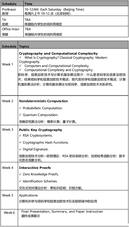 如今人们越来越注重信息的安全性,信息加密技术被广泛应用在计算机信息安全及金融交易过程中。随着网络大数据及线上金融交易的日渐兴起,对于区块链的研究也越来越深入,密码学 作为区块链技术的核心,在保证信息和金融安全上起着重要作用。在本课题中,Prof. Huang 会为大家介绍计算机科学理论基础知识以及与复杂算法相关的理论知识;在学习完必备的理论知识后,教授会带领大家一起探讨计算机科学是如何促进密码学的发展,以及信息加密技术如 何在当今信息储存与金融交易中维护信息的安全与隐私性。