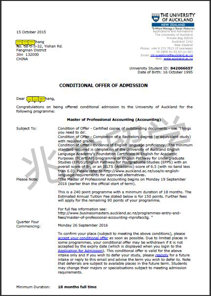 经过兆龙留学后续部老师的努力,成功为中南大学张同学申请到奥克兰大学的录取offer , 以下为学生的offer 分享,在此祝他留学之路顺利!