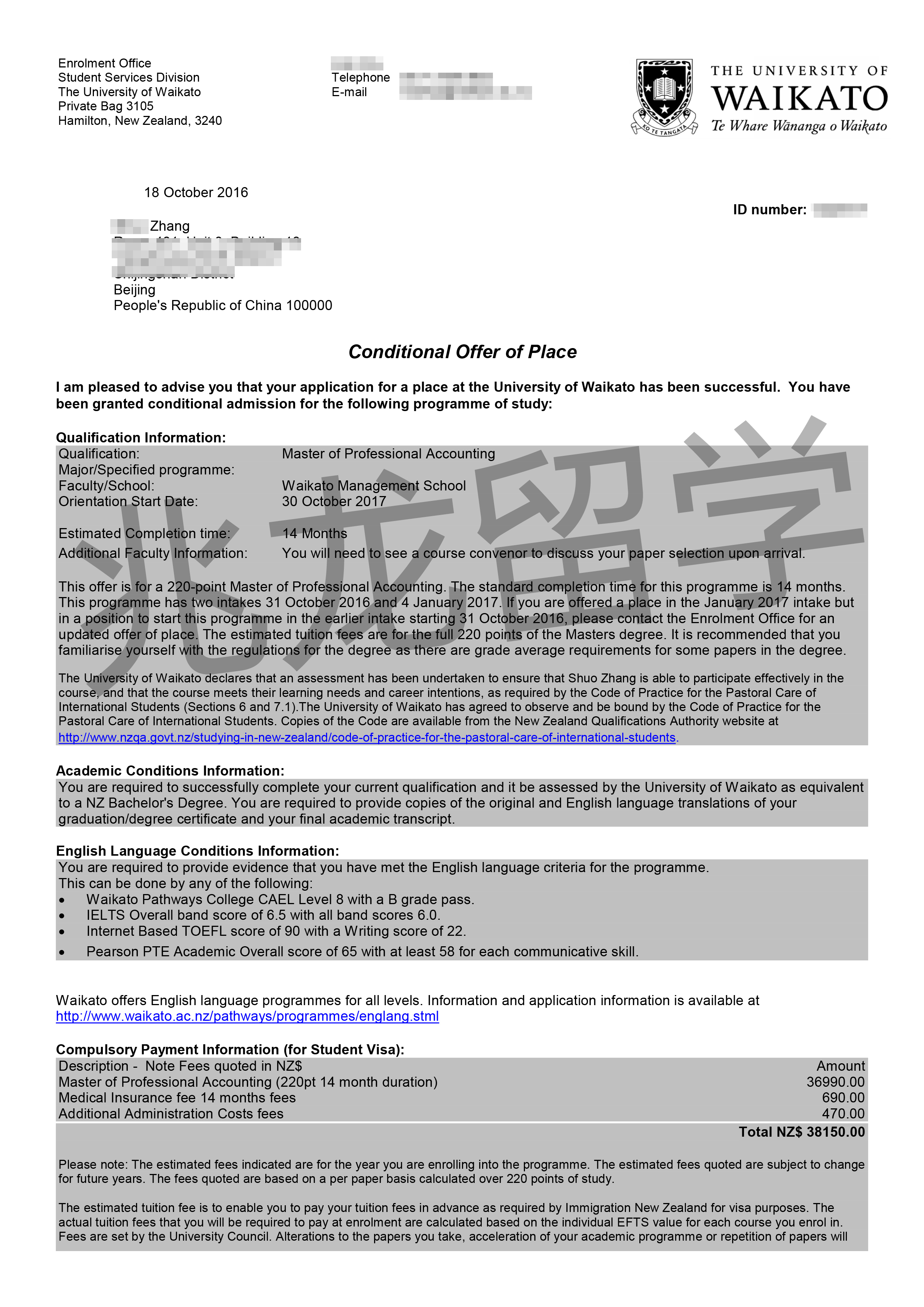 经过兆龙留学网老师的努力,成功为张同学申请到怀卡托大学offer,以下是她的offer分享,在此祝他留学之路一切顺利!