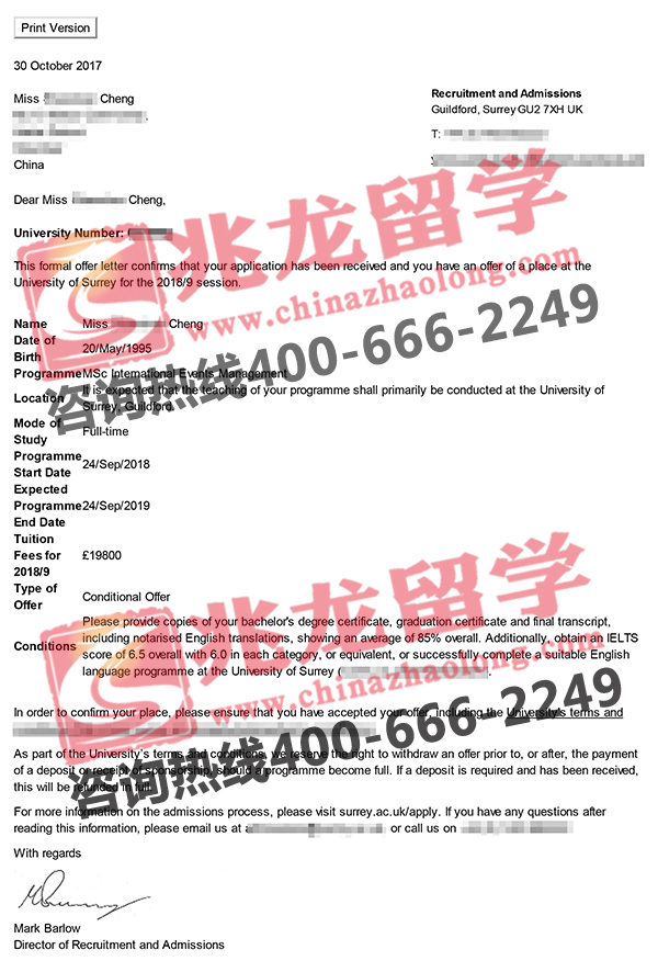 经过兆龙留学欧洲部老师的努力,成功为成同学申请到英国萨里大学国际会议会展管理硕士有条件offer,以下是他的offer分享,在此祝他留学之路一切顺利!更多英国留学申请信息请拨打咨询热线400-666-2249。