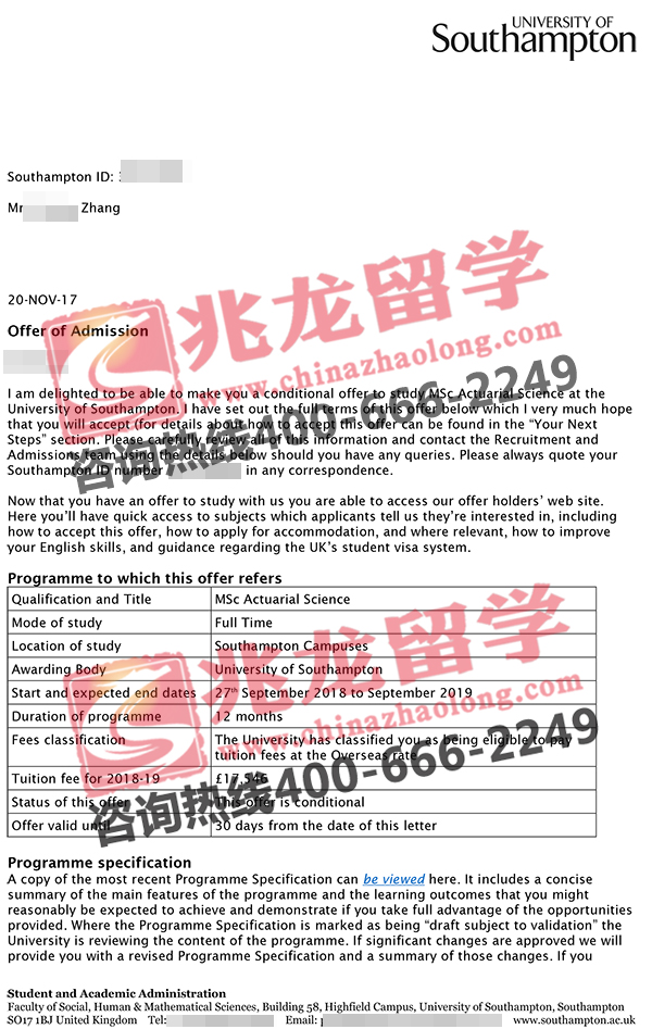 经过兆龙留学英国部老师的努力,成功为张同学申请到英国南安普顿大学-精算专业条件offer,以下是他的offer分享,在此祝他留学之路一切顺利!更多英国留学申请信息请拨打咨询热线400-666-2249。