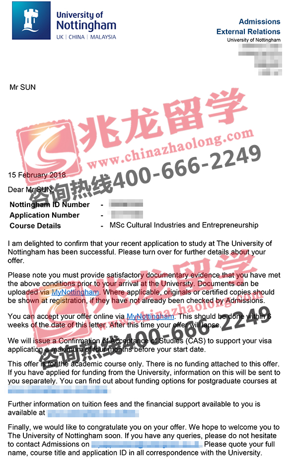 经过兆龙留学英国部老师的努力,成功为孙同学申请到英国诺丁汉大学文化产业与创业硕士Offer,以下是他的offer分享,在此祝他留学之路一切顺利!更多英国留学申请信息请拨打咨询热线400-666-2249。
