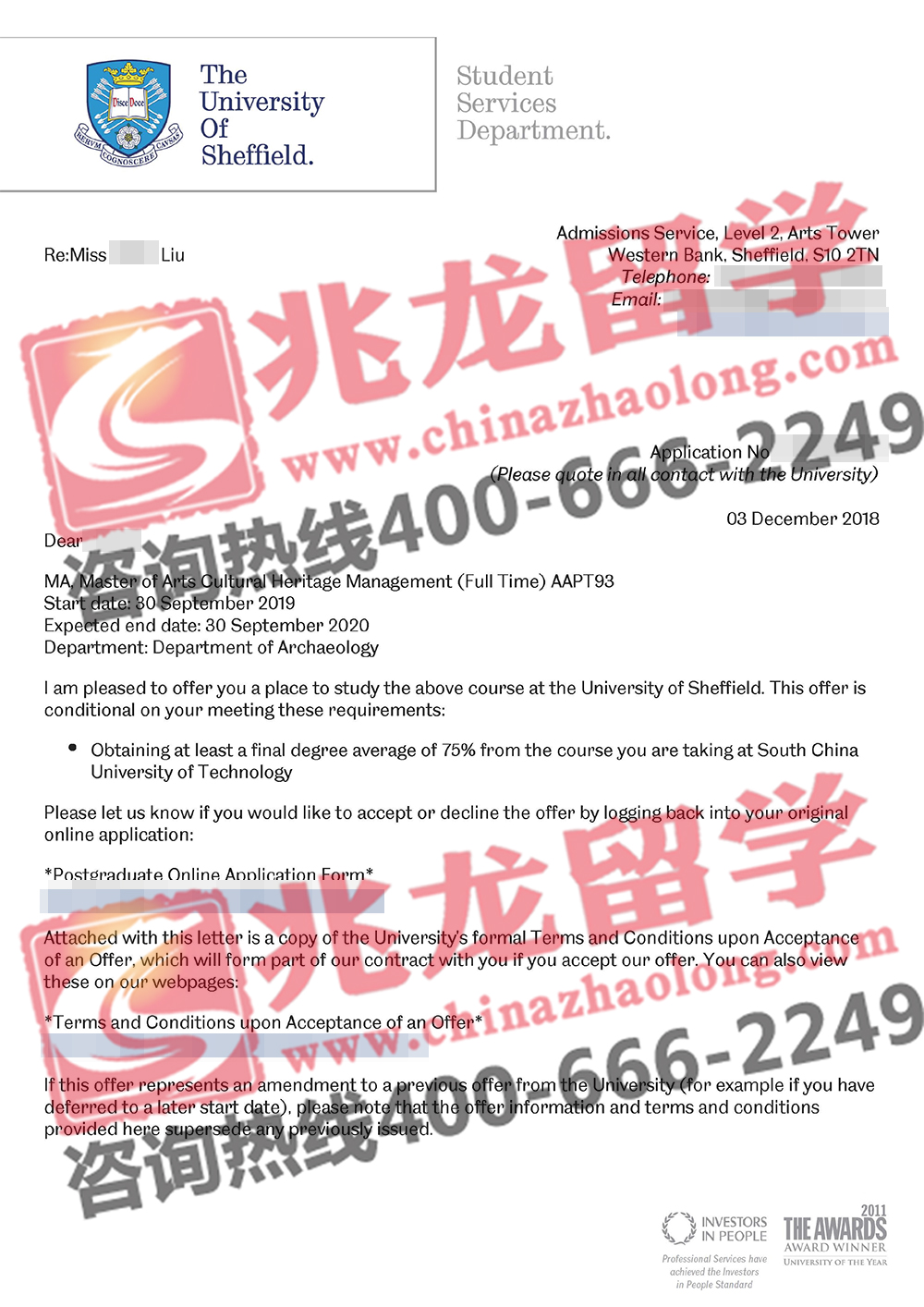 恭喜刘同学获得谢菲尔德大学文化产业管理录取通知书