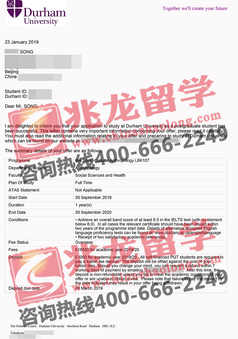 经过兆龙留学英国部老师的努力,成功为宋同学申请到英国杜伦大学社会文化人类学专业Offer,以下是她的offer分享,在此祝她留学之路一切顺利!更多英国留学申请信息请拨打咨询热线400-666-2249。