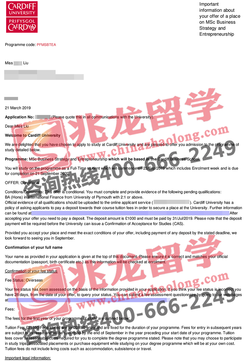 经过兆龙留学英国部老师的努力,成功为刘同学申请到英国卡迪夫大学商务策略和企业家硕士Offer,以下是她的offer分享,在此祝她/他留学之路一切顺利!更多英国留学申请信息请拨打咨询热线400-666-2249。