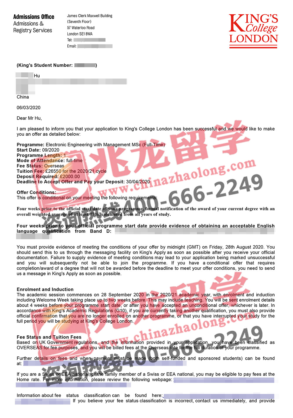 经过兆龙留学英国部老师的努力,成功为胡同学申请到英国KCL伦敦大学国王学院电子工程管理硕士Offer,以下是他的offer分享,在此祝他留学之路一切顺利!更多英国留学申请信息请拨打咨询热线400-666-2249。