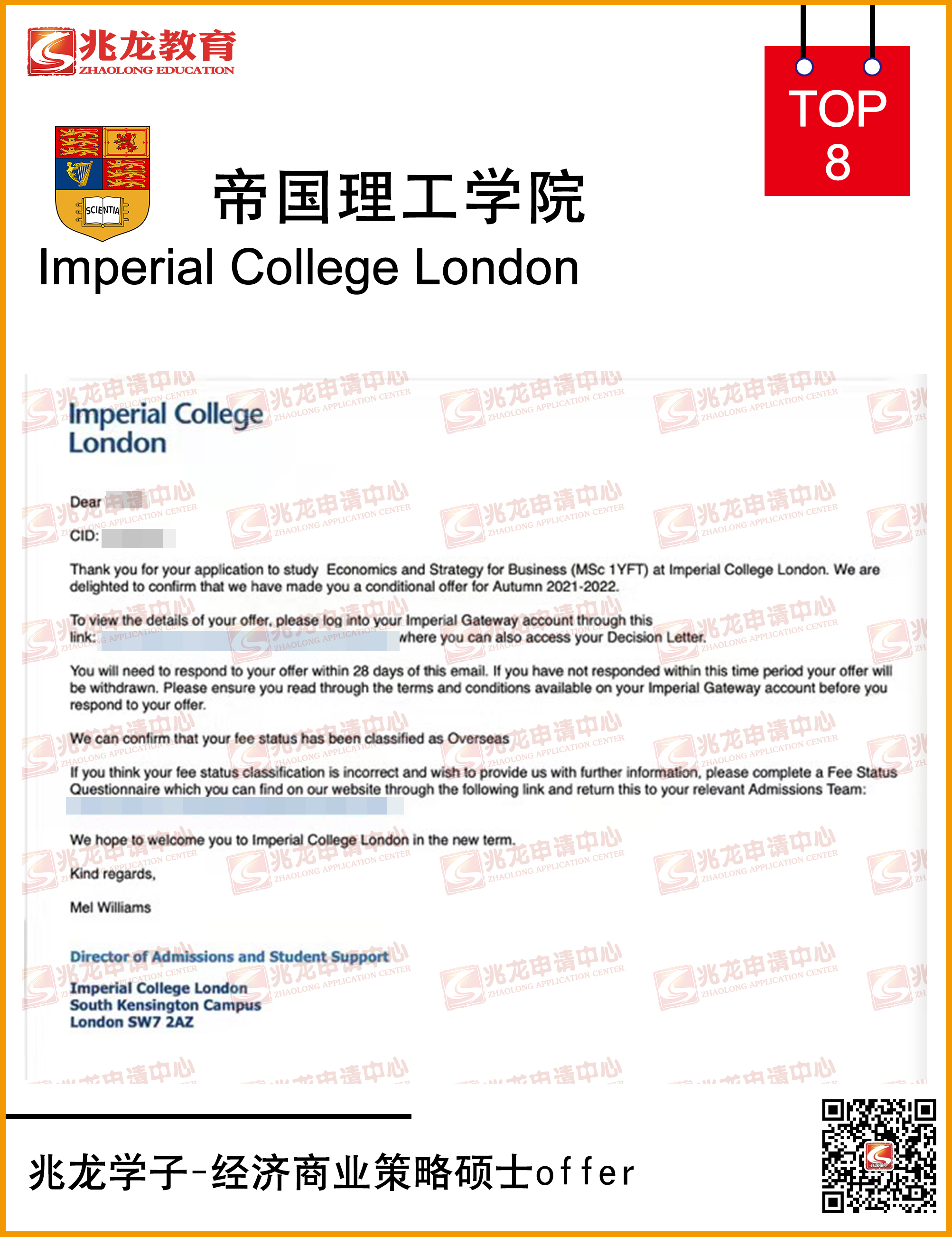 经过兆龙留学英国部老师的努力,成功为兆龙学子申请到英国帝国理工学院经济商业策略硕士Offer,以下是他的offer分享,在此祝他留学之路一切顺利!更多英国留学申请信息请拨打咨询热线010-58702015。