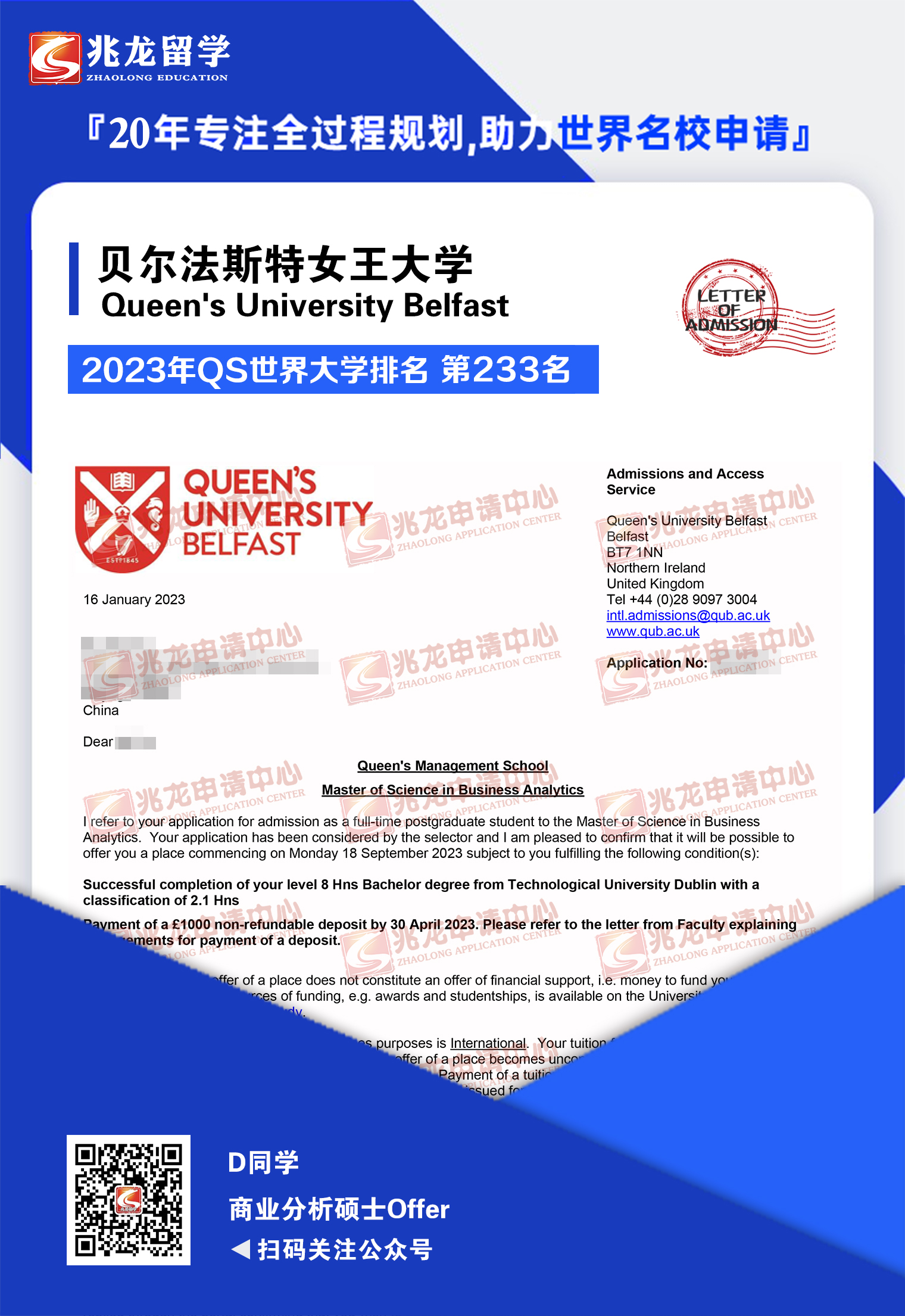 恭喜兆龙留学成功为D同学申请到英国贝尔法斯特女王大学商业分析硕士offer!