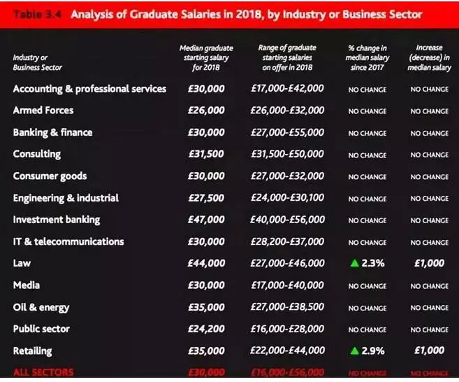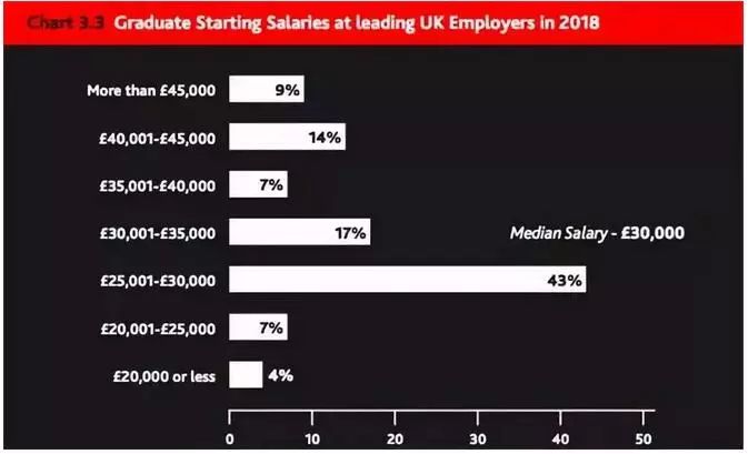 根据2017毕业生起薪数据推测显示,预计顶级雇主雇佣2018年毕业生平均薪资为£30,000英镑,此数据连续4年保持不变。