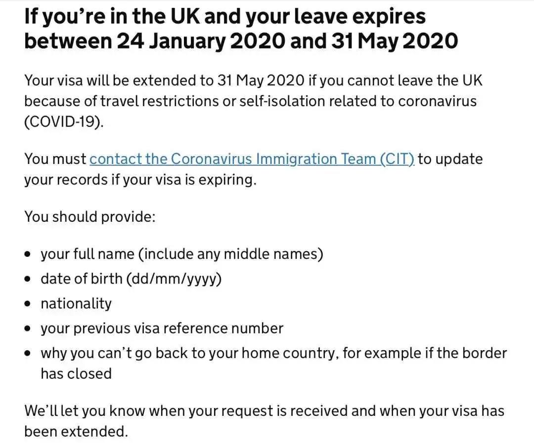 英国内政部日前宣布,现在英国境内、所持英国签证在1月24日至5月31日之间到期的外国公民,如因新冠肺炎疫情导致的旅行限制或自我隔离规定而不能按期离开英国,可申请签证延期至5月31日;原本必须离境返国递交的长期签证申请,也可在英国境内申请转换。
