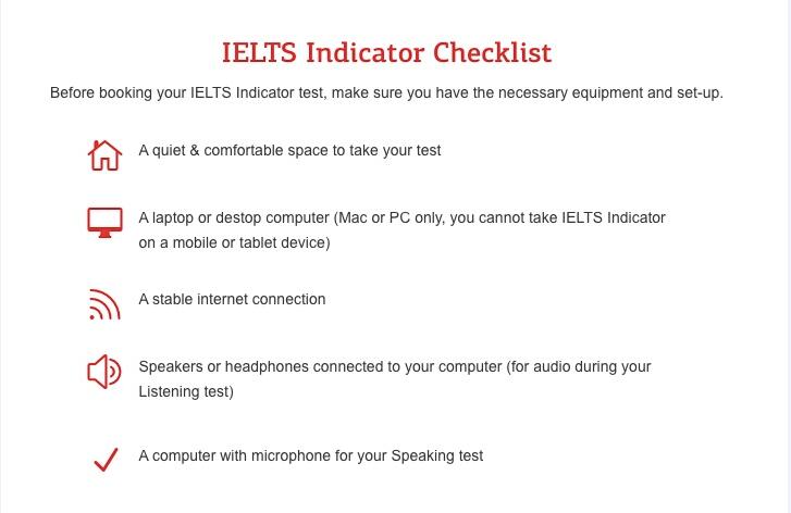 2、考生可以在家中进行IELTS Indicator考试,科目包括听力、阅读、写作和口语。以下为需要准备的物料清单。