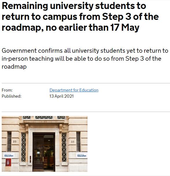 英国政府于当地时间4月13日发布消息,称还没有返校的大学生们,最早可于5月17日回归校园,开启面授课程。