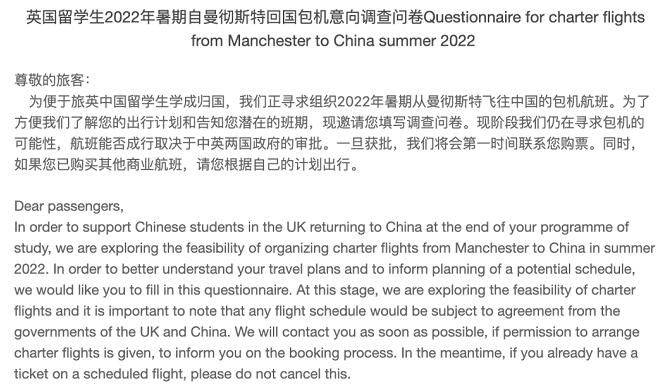 邮件中表示,此次包机航班是针对2022年毕业的中国留学生,现阶段学校仍在寻求包机回国的可能性。目前航班能否成行、具体航班事宜取决于中英两国政府的审批。