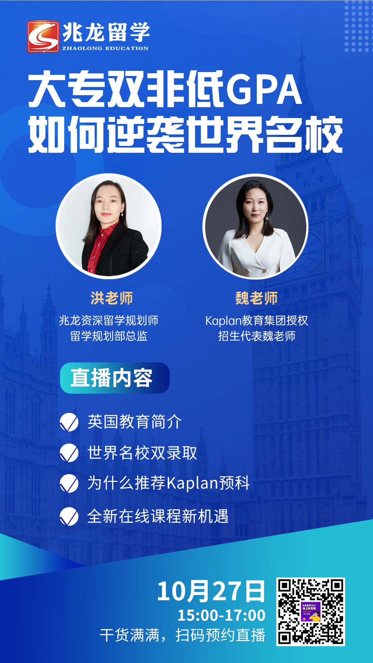 正值2023Fall申请季,兆龙留学携手爱尔兰教育署举行的2022秋季线上院校教育展正在火热进行中,2022年10月27日(周四)15:00-17:00,兆龙留学特邀Kaplan教育集团授权招生代表魏老师,为大家带来一场关于英国本科/硕士预科申请的知识盛宴。