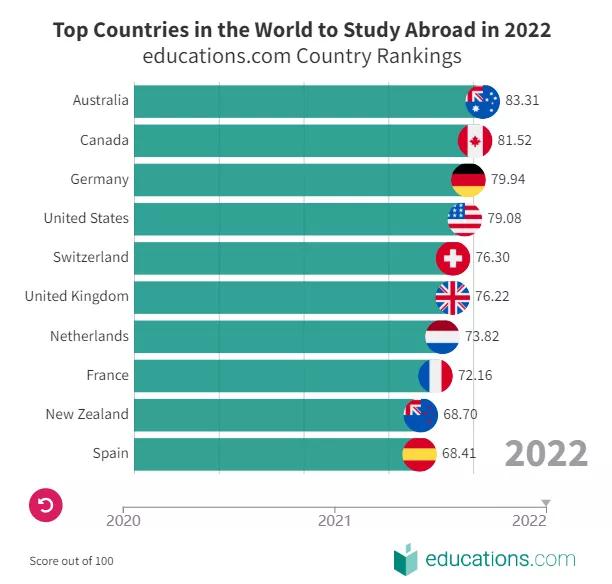 近期,全球教育网站educations.com发布了2022年全球十大最佳留学国家排行榜。