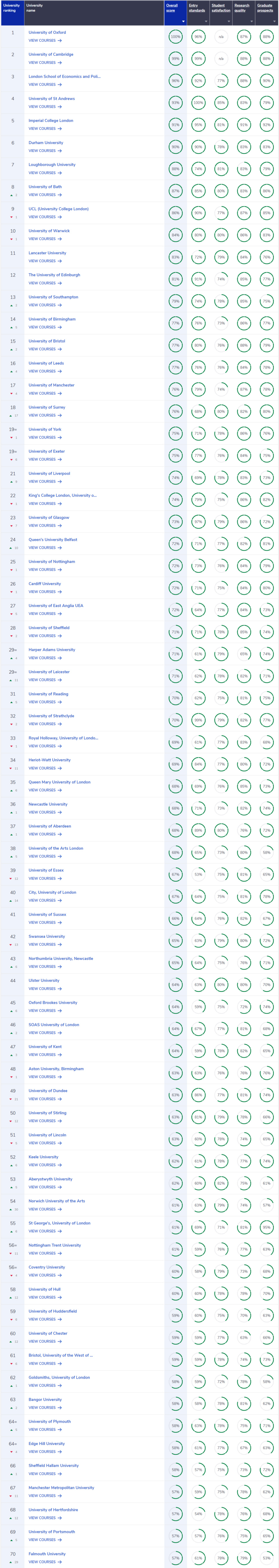 虽然完全大学指南(CUG)的排名不完全侧重于学术,也没有QS排名在世界上那么权威,但是十分建议计划去英国留学的同学们,尤其是本科申请者着重参考一下这个排名。