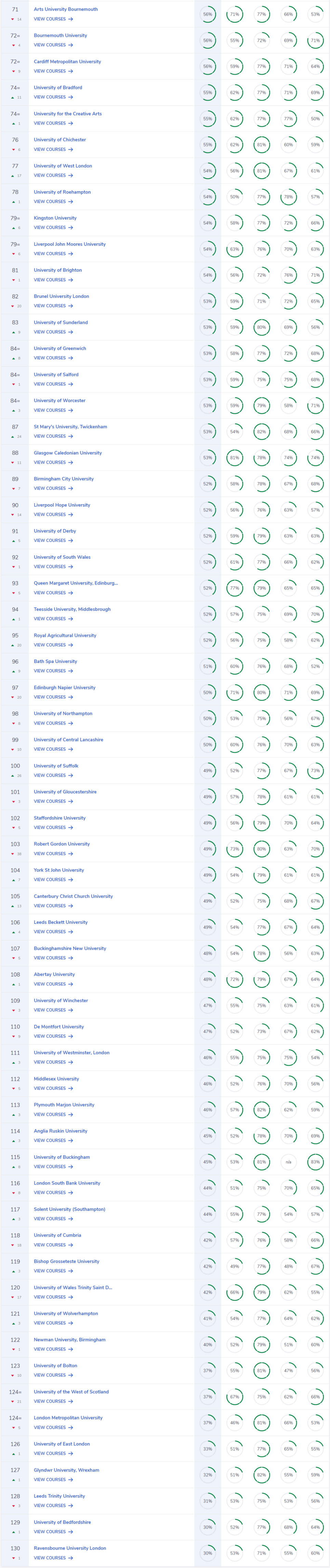 另外,艺术类院校诺里奇艺术大学是今年进步最大的院校,较去年上升了30位,位列第54名。