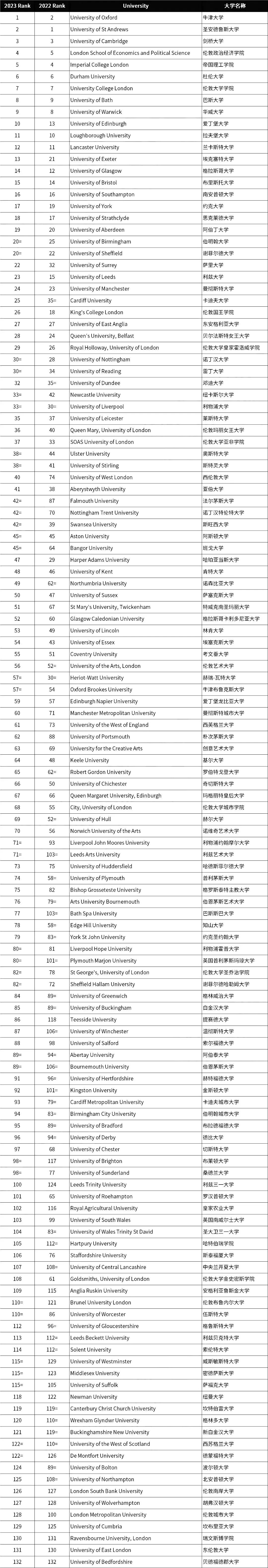 上次的榜首圣安德鲁斯大学由去年的第一,虽然下降一名。但本次依旧超越剑桥大学,排名第二。剑桥大学本次排名第三。排名第4与第5位的伦敦政治经济学院和帝国理工学院,名次与2022年进行了调换。