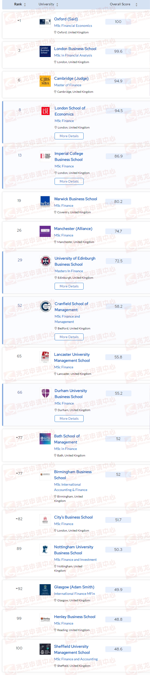 排名前百中,英国一共有31所学校上榜,其中排名前30的依次为:伦敦商学院(3)、帝国理工商学院(14)、伦敦政治经济学院(17)、华威商学院(18)、曼彻斯特商学院(23)、克兰菲尔德商学院(28)。