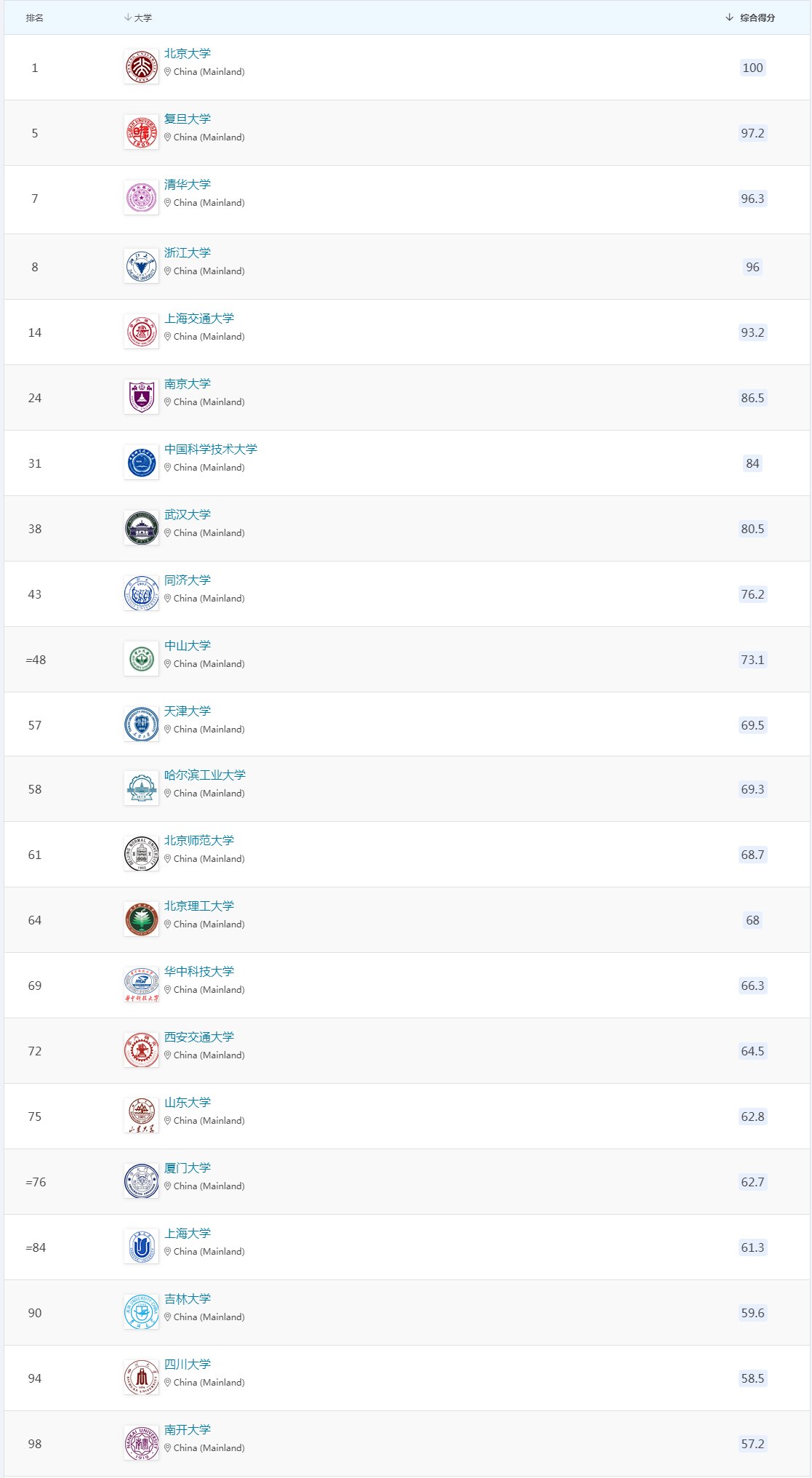 北京大学连续3年蝉联榜首,香港大学继续保持全亚洲第二的位置;去年位居第四的清华大学排名下跌3位,位列第七名的位置。