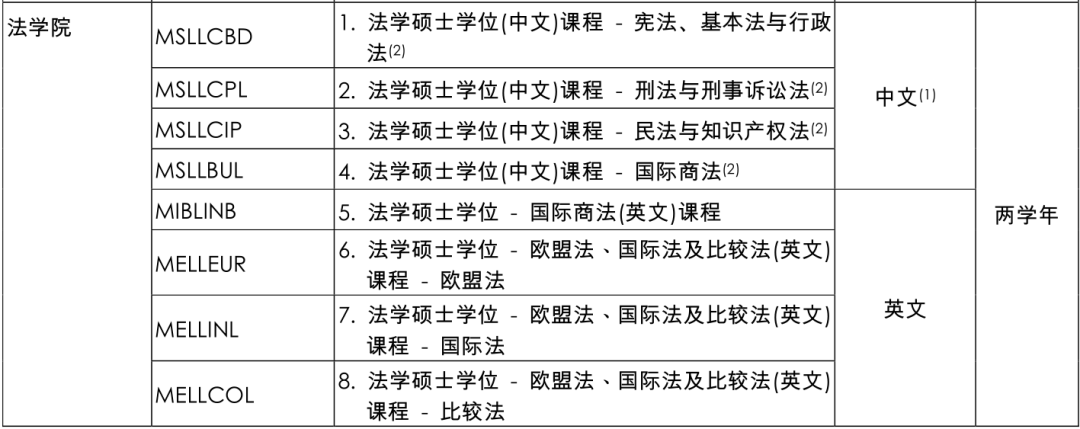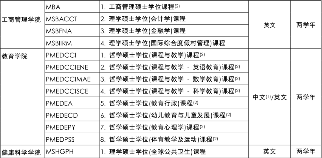 澳大共11大学院(人文学院、工商管理学院、教育学院、健康科学学院、法学院、社会科学学院、协同创新研究院、中华医药研究院、微电子研究院、科技学院、应用物理及材料工程院)提供多个硕士课程供内地生申请。
